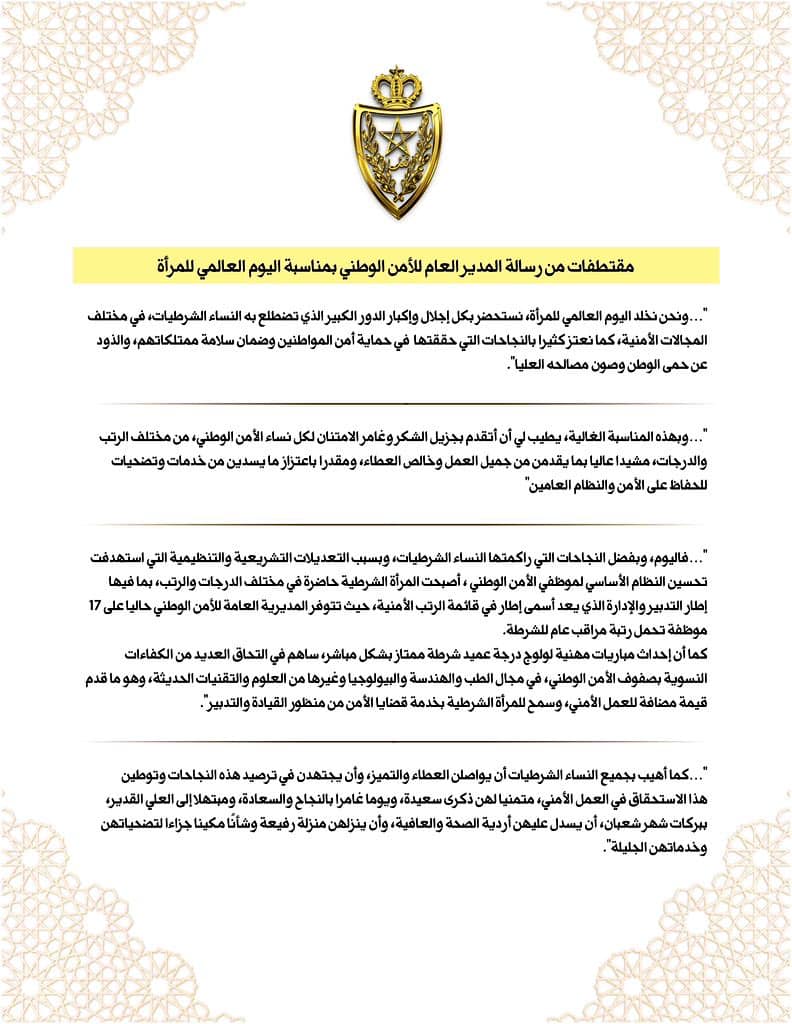 مقتطفات من رسالة المدير العام للأمن الوطني بمناسبة اليوم العالمي للمرأة.