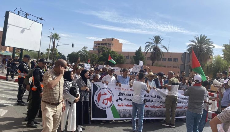 نظمت “الدينامية الديمقراطية المغربية لمناهضة قمة صندوق النقد الدولي والبنك العالمي ومشاركة الكيان الصهيوني”، اليوم الأحد، مسيرة احتجاجية بمدينة مراكش، تنديدا بالفساد المتفشي بالمغرب، واستنكارا للتطبيع والجرائم الصهيونية في حق الفلسطينيين.