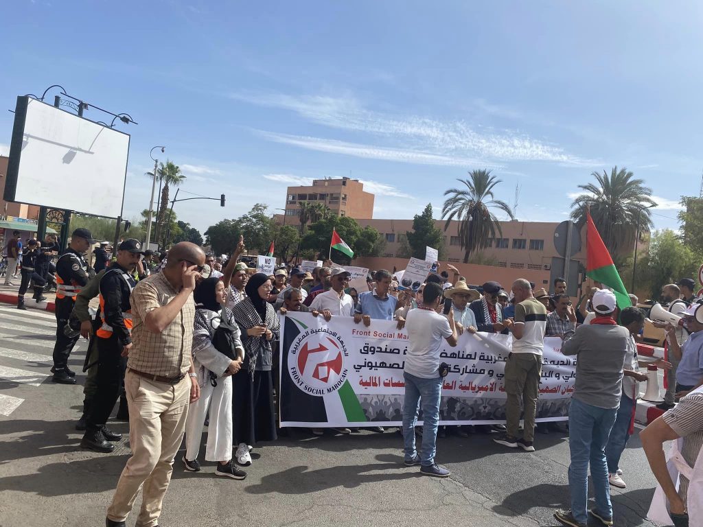كما استنكر المشاركون في المسيرة السياسات الإمبريالية للمؤسسات المالية الدولية التي تجتمع في مدينة مراكش، والتي تفاقم معاناة شعوب بلدان الجنوب، وتشدد عليها الخناق عبر الديون المتراكمة التي تفقدها سيادتها، وتفاقم من استنزاف خيراتها وثرواتها.