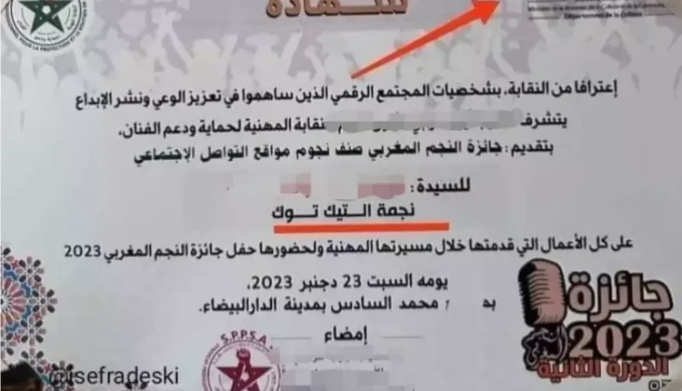 تداولت عدد من الصفحات الفايسبوكية، صورة لشهادة تقديرية تم منحها لإحدى مؤثرات منصة “التيك توك ” المثيرة للجدل، ضمن فعاليات “حفل جائزة النجم المغربي” بالدارالبيضاء يوم أمس السبت.