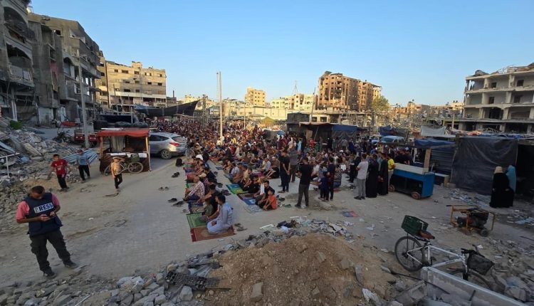 وأدى الآلاف من المصلين صلاة العيد قرب أنقاض المساجد المدمرة وفي ساحات مراكز الإيواء فيما بدا المظهر الوحيد الحاضر من مظاهر عيد الأضحى في قطاع غزة.