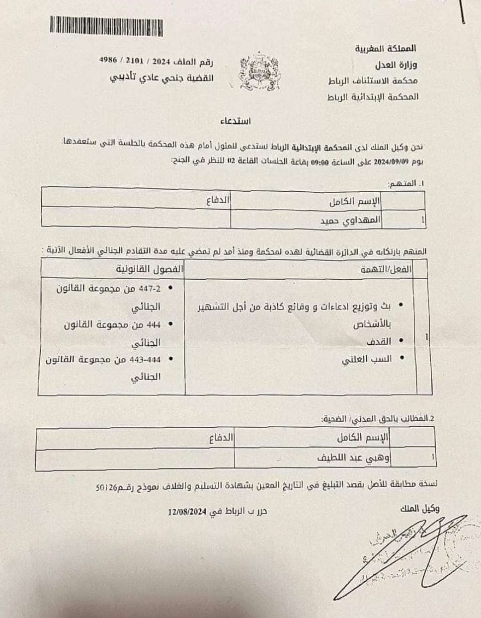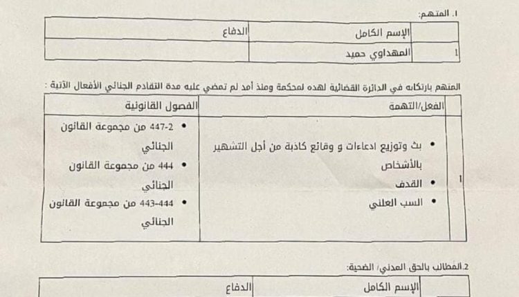 وقرر وكيل الملك لدى المحكمة الابتدائية بالرباط، إحالة الصحفي حميد المهداوي، إلى أولى جلسات المحاكمة المقرر عقدها في9 شتنبر القادم ، على خلفية الدعوى القضائية التي رفعها ضده عبد اللطيف وهبي.