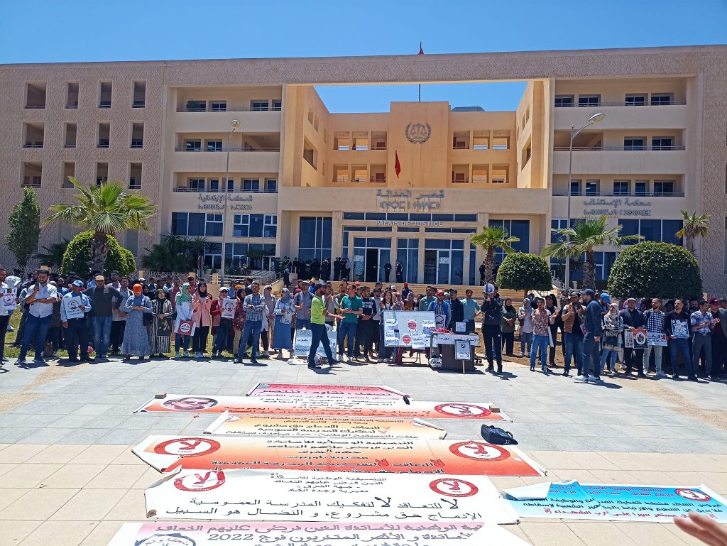 ونظم أساتذة التعاقد وقفات احتجاجية قطبية بست مدن مغربية؛ هي الرباط وبني ملال وأكادير ومراكش ووجدة والحسيمة، تنديدا بالمحاكمات “الصورية” في حق زملائهم.