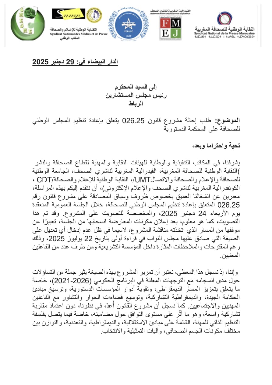 وجهت النقابة الوطنية للإعلام والصحافة التابعة للكونفدرالية الديمقراطية للشغل و الكونفدرالية المغربية لناشري الصحف والإعلام الإلكتروني و هيئات مهنية صحفية، النقابة الوطنية للصحافة المغربية والفيدرالية المغربية لناشري الصحف، والجامعة الوطنية للصحافة والاعلام والاتصال – الاتحاد المغربي للشغل، رسالة مفتوحة إلى رئيس الحكومة عزيز أخنوش، طالبته فيها بالتدخل العاجل لسحب مشروع القانون رقم 26.25 المتعلق بإعادة تنظيم المجلس الوطني للصحافة من مجلس المستشارين.