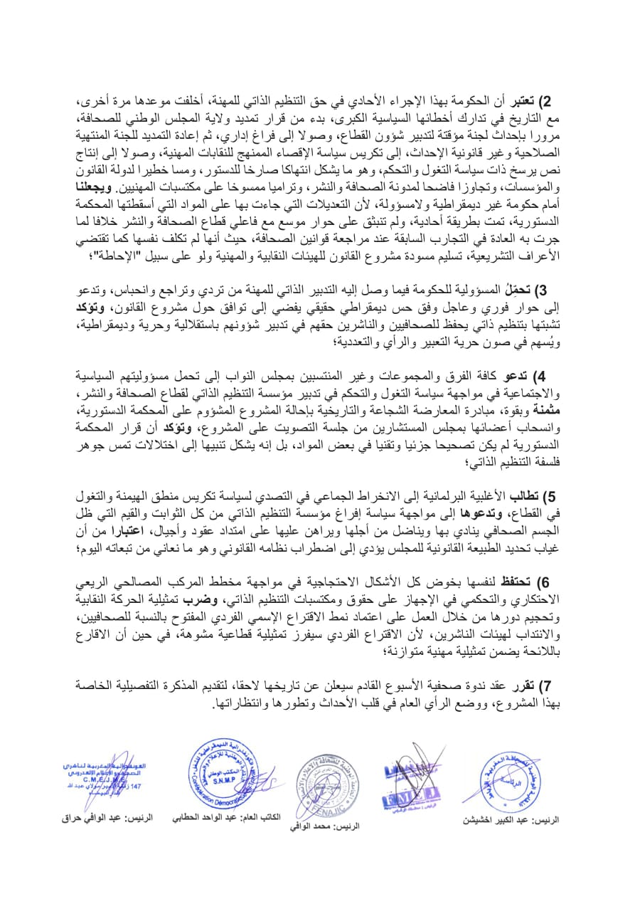 3) تحمِّلُ المسؤولية للحكومة فيما وصل إليه التدبير الذاتي للمهنة من تردي وتراجع وانحباس، وتدعو إلى حوار فوري وعاجل وفق حس ديمقراطي حقيقي يفضي إلى توافق حول مشروع القانون، وتؤكد تشبتها بتنظيم ذاتي يحفظ للصحافيين والناشرين حقهم في تدبير شؤونهم باستقلالية وحرية وديمقراطية، ويُسهم في صون حرية التعبير والرأي والتعددية؛