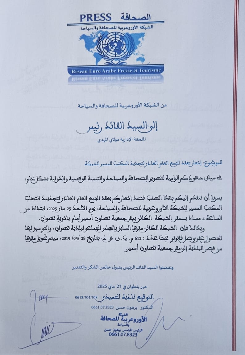 وإخبار الرأي العام عن فتح باب الترشيح لعضوية المكتب الجديد للشبكة الأوروعربية للسياحة والصحافة؛